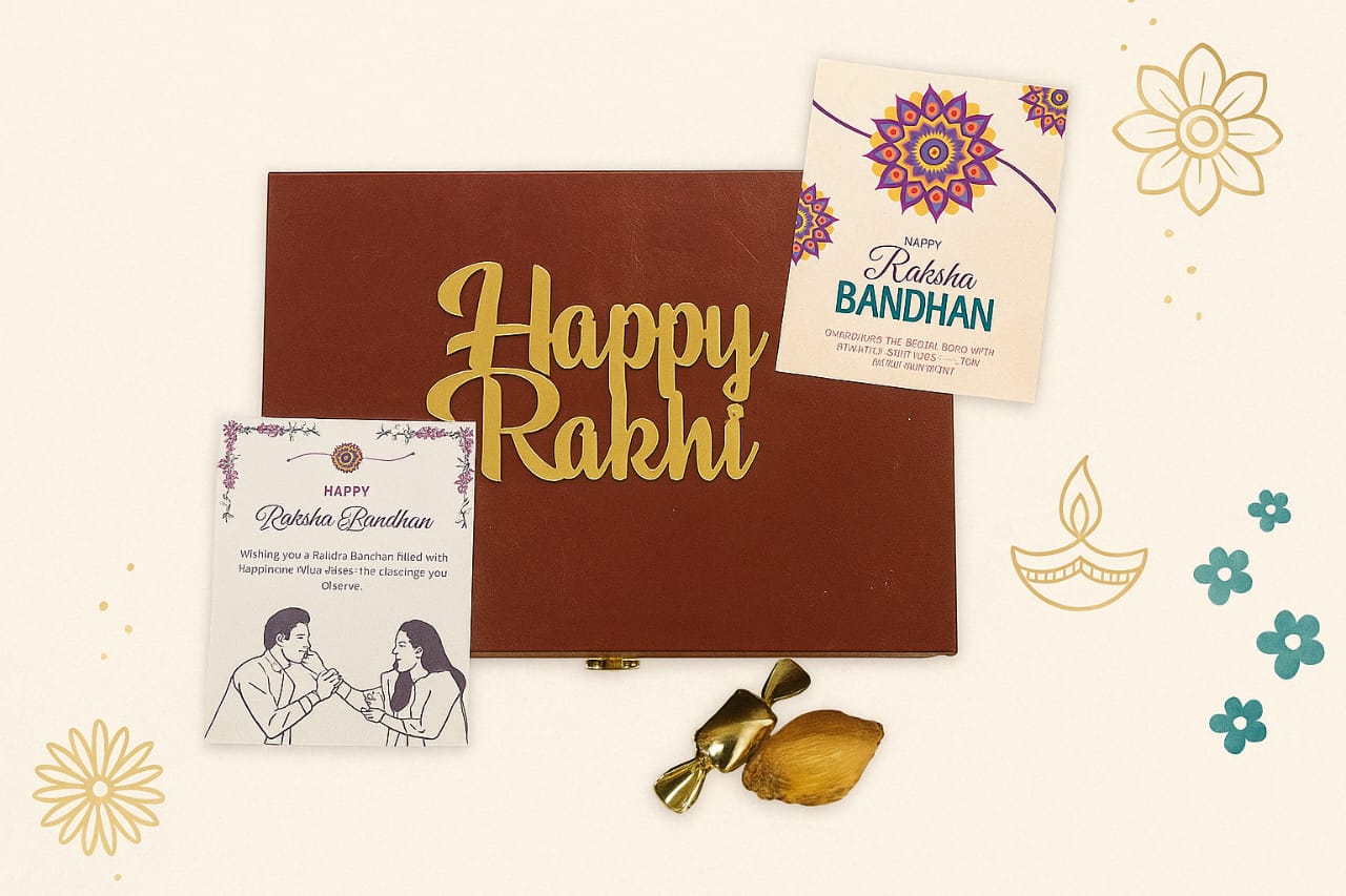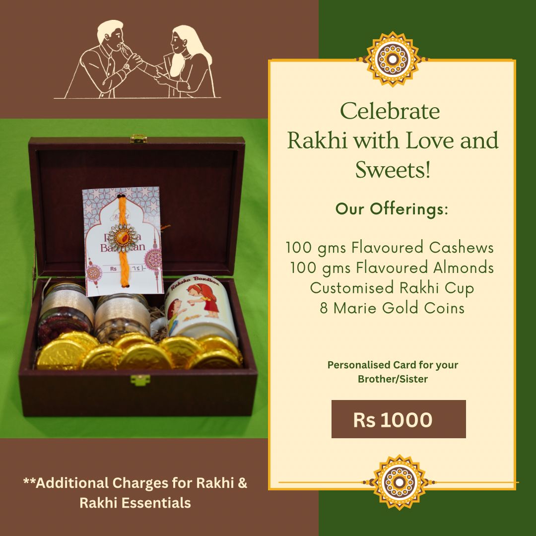 A keepsake wooden box filled with 100g each of almonds and cashews, 8 Marie Gold coins, and a personalised Rakhi cup. This hamper is for the brother who deserves the very best!