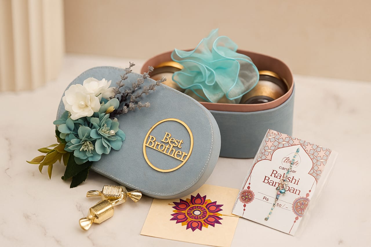 A sophisticated blue box holding 100g cashews, 100g almonds, and 10 stuffed dates. Adorned with floral detailing and a ‘Best Brother’ tag – this hamper is perfect for a heartfelt Rakhi gesture.