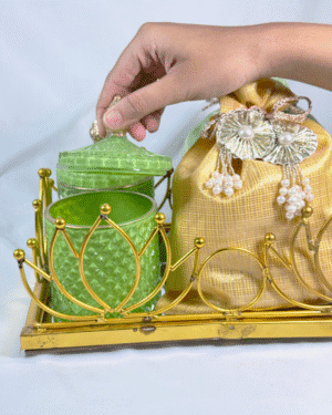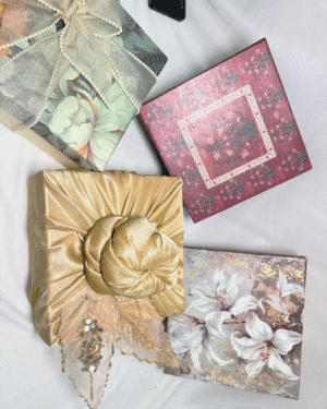 A compact bundle of joy—includes 100g each of almonds and cashews, and 3 Marie Gold coins. Comes in a modern pouch with custom Rakhi card. Small in size, big on love!