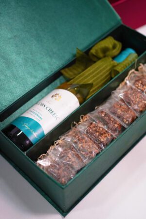 Unwind in style with our Sips & Crunch Luxe Box — a refined pairing of indulgence and elegance. Nestled in a rich, emerald-green gift box, this hamper features a premium bottle of Jacob’s Creek Chardonnay (2022) and ten artisanal almond brittles, individually packed for freshness and delight.