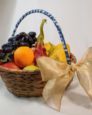 An elegant cane basket filled with handpicked exotic fruits – from juicy grapes to crisp apples, citrusy oranges, ripe bananas, and luscious pears. Tied with a delicate organza ribbon, this wholesome hamper makes the perfect gesture of health and celebration.